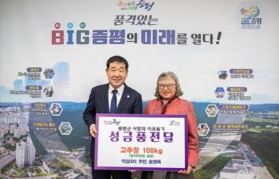 증평군 증평읍 주민 송영옥 씨가 지난 7일 증평군청을 방문해 직접 만든 고추장 500g 200개(100만원 상당)을 전달했다.