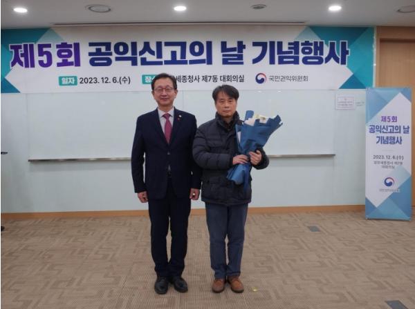 지난 6일 정부세종청사에서 국민권익위원회에서 주관한 제5회 공익신고의 날 기념행사’에서 부패·공익 신고자 보호·보상 관련 원주시 감사관 김종근 직무조사팀장이 공익신고자의 보호·지원 업무에 적극 참여한 점을 인정받아 국민권익위원장 표창을 수상했다.