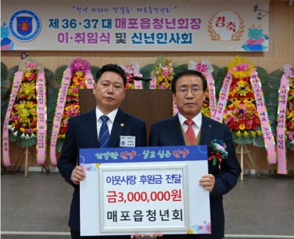 청년회는 같은 날 저녁에 진행된 제37대 매포읍청년회장 취임식과 신년인사회에서 기관, 단체, 개인 등에게 화환 대신 전달받은 축하금을 성금으로 마련해 전달했다.