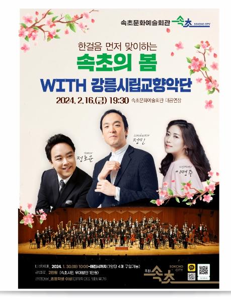 [singers news 씽어즈뉴스, 와보소기자] 속초시는 속초문화예술회관 2024년 첫 번째 기획공연으로 “한걸음 먼저 맞이하는 『속초의 봄 WITH 강릉시립교향악단』”을 2월 16일 금요일 저녁 7:30에 개최한다.