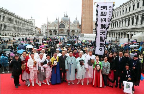 [singers news 씽어즈뉴스, 와보소기자] ‘마르코폴로의 여행’을 주제로 10일간 열린 이탈리아 베네치아 카니발 축제의 대미를 장식하는 폐막식에서 안동이 자랑하는 세계유산 하회별신굿탈놀이 무대가 펼쳐졌다. 공연단은 2월 13일 산마르코 광장에서 신명 나는 공연으로 전 세계인과 함께 흥겨운 마당을 열었다.