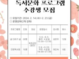 수강 신청은 14일부터 옥천군민도서관 홈페이지를 통해 선착순으로 이루어지고 있으며, 성인 독서문화프로그램은 전화로 신청할 수 있다.
