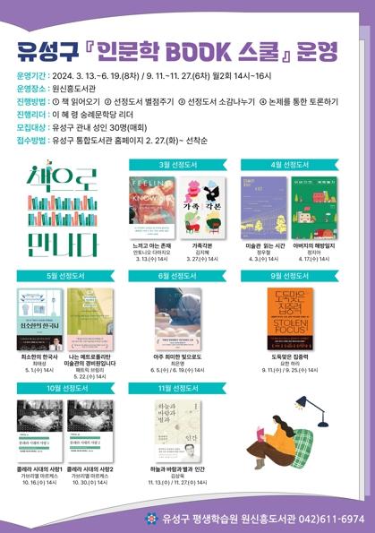 인문학 BOOK 스쿨은 독서콘텐츠 전문가와 함께 읽기를 통해 독서의 즐거움과 깊이를 나누는 독서 토론형 강좌로, 3월부터 6월까지 ▲느끼고 아는 존재 ▲가족각본 ▲미술관 읽는 시간 ▲아버지의 해방일지 ▲5천년 역사가 단숨에 이해되는 최소한의 한국사 ▲나는 메트로폴리탄 미술관의 경비원입니다 ▲아주 희미한 빛으로도 등 7권, 9월부터 11월까지 ▲도둑맞은 집중력 ▲콜레라 시대의 사랑 ▲하늘과 별과 바람과 인간 등 3권, 총 10권의 도서를 읽을 예정이다.
