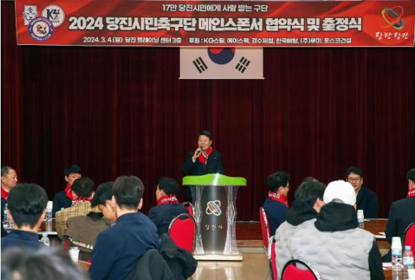 [singers news 씽어즈뉴스, 와보소기자] 당진시민축구단이 4일 당진종합운동장 트레이닝센터에서 2024시즌 출정식을 개최하며 새 시즌의 힘찬 발걸음을 내디뎠다.