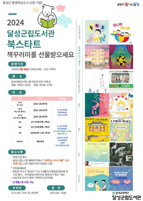 ‘2024 달성군립도서관 북스타트’는 올해 고등학생까지 배부 대상을 확대하여 1단계(2022~2024년생), 2단계(2020~2021년생), 3단계(2018~2019년생), 초등 책꾸러미(초등1학년, 2017년생), 중등 책꾸러미(중등1학년, 2011년생),