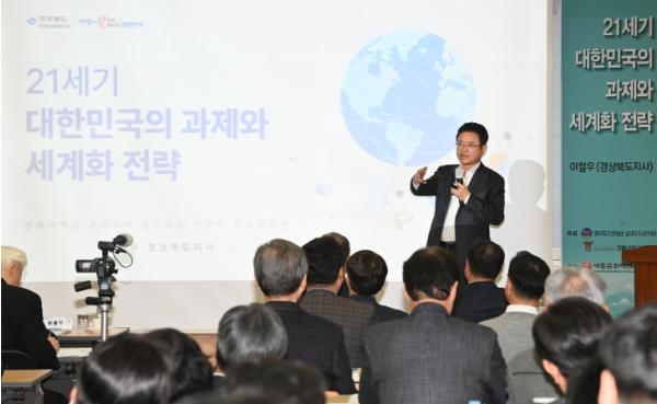 [singers news 씽어즈뉴스, 와보소기자] 이철우 경북도지사는 14일 경북대학교 박물관 시청각실에서 경북대학교 이인중 부총장을 비롯한 유라시아 실크로드 인문학 최고위 과정 관련 인사를 대상으로 ‘21세기 대한민국의 과제와 세계화 전략’이라는 주제의 특별 초청 특강을 펼쳤다.