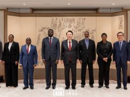 [singers news 씽어즈뉴스, 와보소기자] 윤석열 대통령은 3월 19일 오후 대통령실에서 제3차 민주주의 정상회의 1일 차 장관급회의 참석차 방한한 아프리카 5개국 장·차관급 인사들을 접견했다.