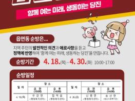 순방은 오전 10시와 오후 2시에 2곳의 읍면동에서 진행하며 △4.18 우강면, 합덕읍 △4.22 당진3동, 송악읍 △4.23 석문면, 고대면 △4.24 순성면, 면천면 △4.26 신평면, 송산면 △4.29 당진2동, 당진1동 △4.30 정미면, 대호지면 순으로 진행할 예정이다. 자세한 사항은 당진시청 누리집 공지사항을 참고하면 된다.