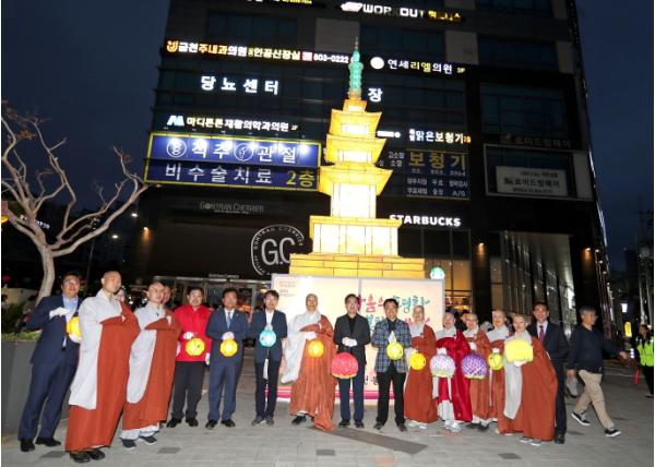 금천불교사암연합회장 현민 스님은 “오늘 켜지는 밝은 빛과 부처님의 자비가 금천구에 널리 퍼지기를 기원한다”라고 말했다.