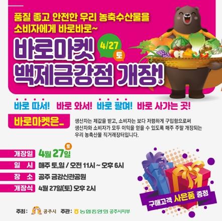 [singers news 씽어즈뉴스, 와보소기자] 공주시는 지역에서 생산한 제철 농산물을 합리적인 가격에 구매할 수 있는 충청남도 대표 직거래장터인 ‘바로마켓 백제금강점’이 오는 27일 금강신관공원에서 개장한다고 밝혔다.