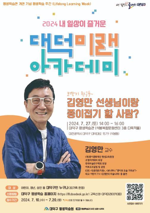 [singers news 씽어즈뉴스, 와보소기자] 대전 대덕구는 오는 27일 ‘2024년 내 일상이 즐거운 대덕미래아카데미’의 일환으로 ‘종이접기 아저씨’ 김영만 교수를 초청해 강연을 진행한다고 밝혔다.