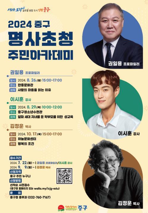 [singers news 씽어즈뉴스, 와보소기자] 인천시 중구는 오는 8월과 10월에 프로파일러 권일용 교수, 성교육 전문가 이시훈 강사, 문화심리학자 김정운 박사와 함께하는 명품 인문학 특강 ‘2024년 중구 명사초청 주민아카데미’를 개최한다고 10일 밝혔다.