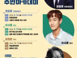 한편, ‘중구 명사초청 주민아카데미’는 지역의 문화콘텐츠 역량을 강화하고, 다양한 명사 강연으로 구민들에게 심신 힐링과 소통의 장을 제공하는 데 목적을 둔 프로그램이다.