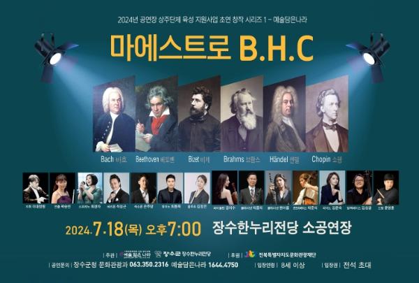 [singers news 씽어즈뉴스, 와보소기자] 장수군이 전북특별자치도문화관광재단 공모사업으로 추진하는 ‘마에스트로 B·H·C’ 공연이 오는 7월 18일 오후 7시에 장수한누리전당 소공연장에서 열린다.