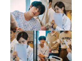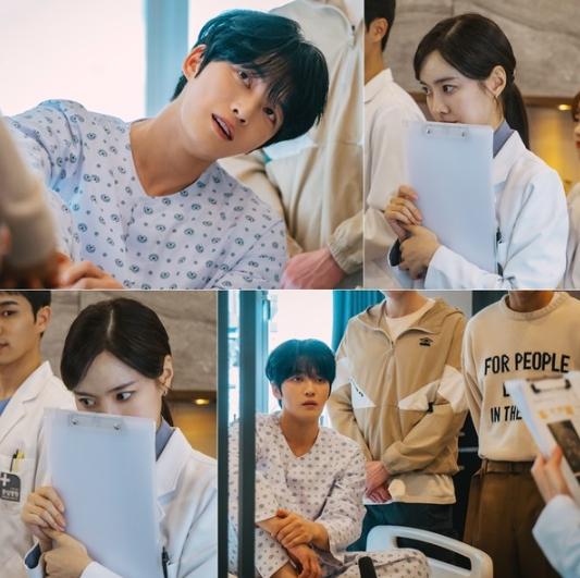 이군의 지나친 플러팅을 한 몸에 받은 경주연은 얼굴을 숨기기 급급한 모습. 경주연은 유일한 가림막 진료 차트로 얼굴을 가리며 어쩔 줄 몰라 하는데, 그런 경주연을 바라보는 동료 의사들의 의문 담긴 눈빛 또한 웃음보를 자극한다.