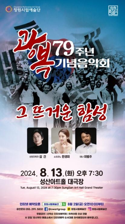[singers news 씽어즈뉴스, 와보소기자] 창원특례시는 광복 제79주년을 맞이하여 오는 8월 13일오후 7시 30분 성산아트홀 대극장에서 제79주년 광복 기념음악회를 개최한다.