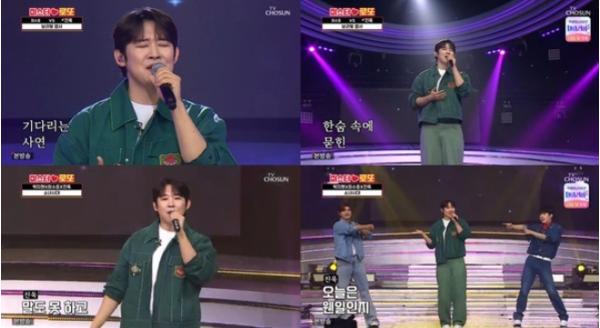 이어 진욱은 최수호와의 대결에 앞서 "오늘 이겨서 수호 얼굴을 보랏빛으로 만들어 주려고 설운도 선배님의 '보라빛 엽서'를 준비했다"라며 남다른 승부욕을 드러냈다. 이후 진욱은 '보라빛 엽서' 무대를 통해 감미로운 목소리와 안정적인 가창력으로 부드러운 매력을 발산했다.