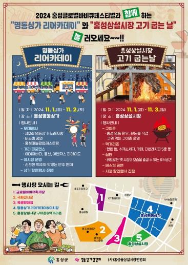 메인 바비큐장에서 도보 3분 거리에 위치한 홍성명동상가는 11월 1일과 2일 양일간 ‘리어카데이 야시장’을 운영한다. 제2회 명동상가 노래자랑과 버스킹 공연, 홍성마늘팝업레스토랑이 진행될 예정이며, 에어아바타와 어벤저스 퍼레이드 등 이색적인 거리 퍼포먼스도 선보인다.