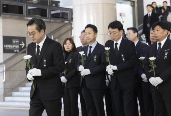 [singers news 씽어즈뉴스, 와보소기자] 김동연 경기도지사가 31일 김성중 행정1부지사, 고영인 경제부지사, 조선호 소방재난본부장, 주요 실국장들과 수원역에 마련된 제주항공 여객기 사고 희생자 합동분향소를 방문해 희생자들을 추도했다.